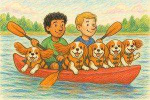 Benni hatte schon Wochen vorher ein aufblasbares Kajak organisiert, das stabil genug war, um auch die Hunde mitzunehmen. Mit etwas Übung schafften es alle, sicher im Boot zu sitzen – Paulinchen vorne als kleine Kapitänin, Bela neugierig in der Mitte, und Suzi gemütlich zwischen Benni und Oliver.