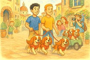 Natürlich erregten drei kleine Cavalier King Charles Spaniels überall Aufmerksamkeit. Touristen lächelten, Kinder winkten, und manche fragten sogar nach einem Foto mit den süßen Fellnasen. Mittags fanden sie ein hundefreundliches Café mit Blick auf die Adige, wo sie Pasta und Cappuccino genossen – und die Hunde frisches Wasser und ein paar Leckerli bekamen.